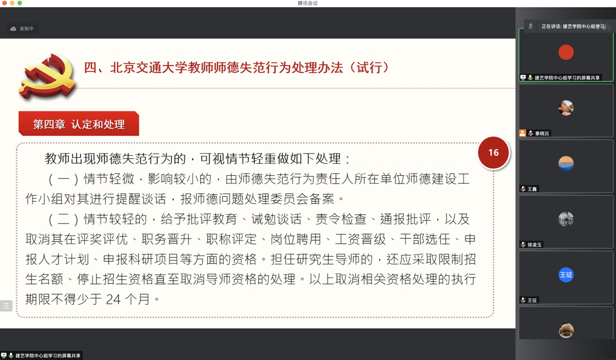 学院党委书记秦思阳带领大家系统学习了党的十八大以来习近平总书记关于教师队伍特别是教师思想政治和师德师风建设的重要论述,对《北京交通大学师德建设长效机制实施办法(2019年修订)》、《北京交通大学关于加强和改进新时代师德师风建设的实施方案》、《北京交通大学教师师德考核办法》、《北京交通大学教师师德失范行为处理办法(试行)》等学校重要制度文件进行了详细解读,结合学院工作实际,强调了当今师德师风建设的极端重要性。