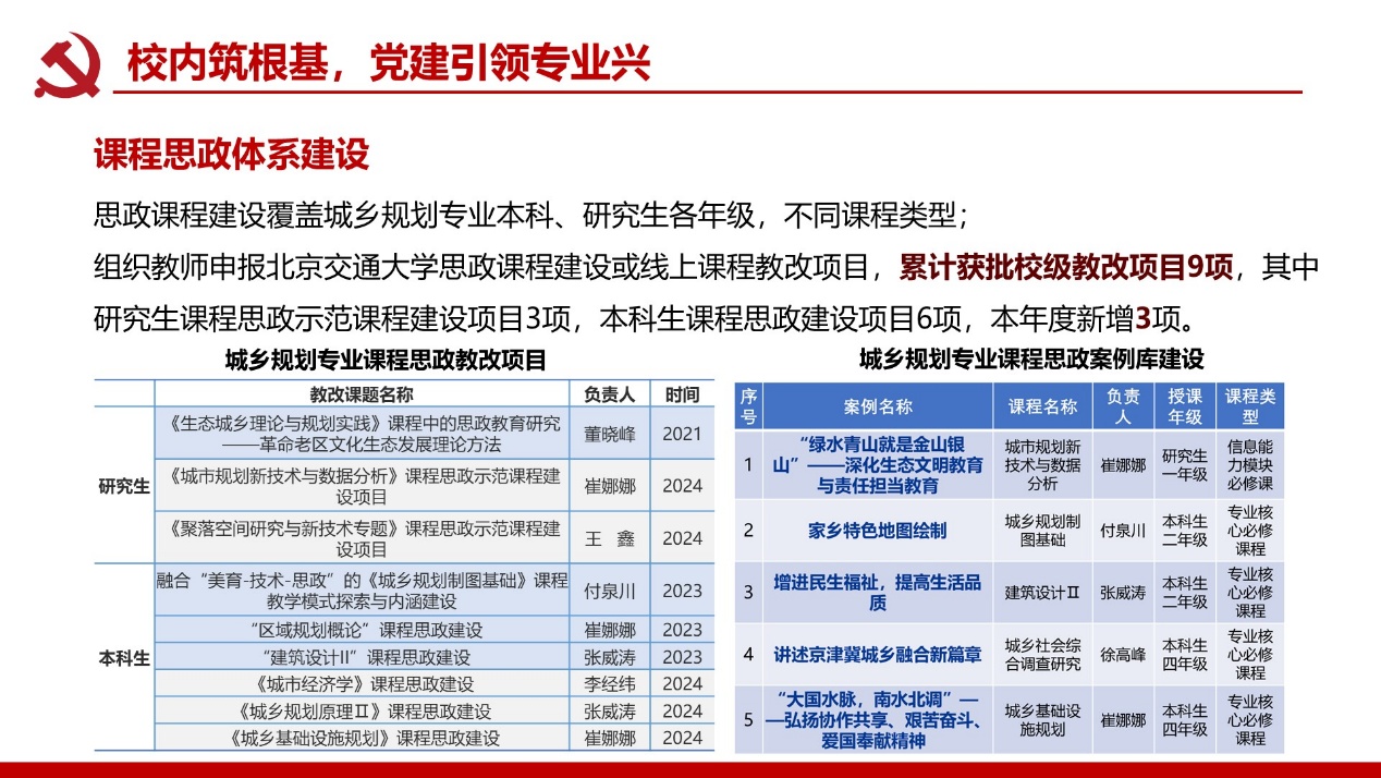 北京交通大学城乡规划系教师党支部共有党员教师13人,支部始终紧扣立德树人根本任务,通过夯实基础、凝聚力量、强化实践,推动学科与党建深度融合。支部围绕学科发展、文化传承与社会需求,探索 “师生协同、校地融合、校企共建”多维创新机制,成效显著。