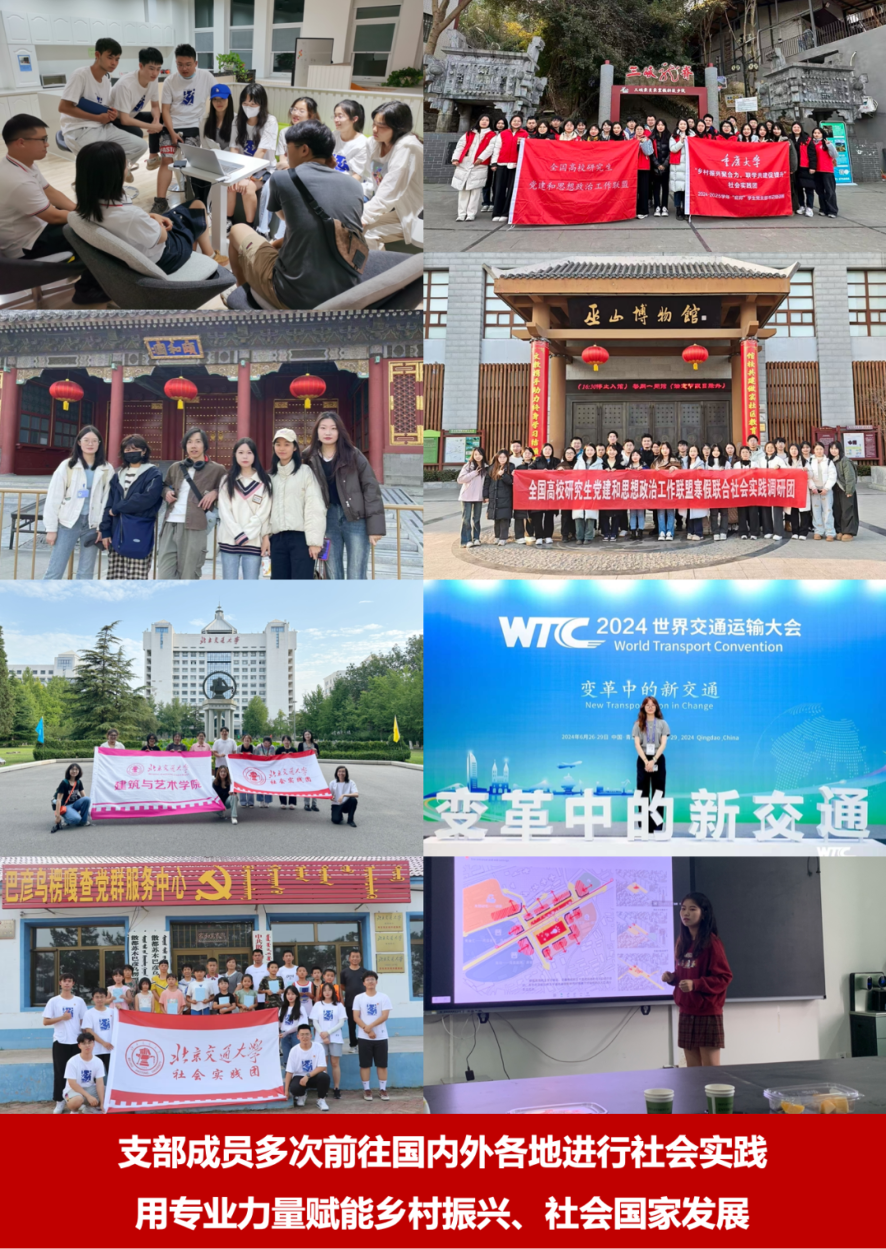 争做社会实践的“排头兵”。支部成员2年内开展社会实践10余次,足迹遍布国内外多个地区,“一带一路”建设、2024WTC交通大会视觉设计、河北邯郸户村镇品牌设计、非遗文化探索等都有支部成员的努力和汗水,生动诠释了青年党员在社会建设、乡村振兴、国家发展的责任担当。