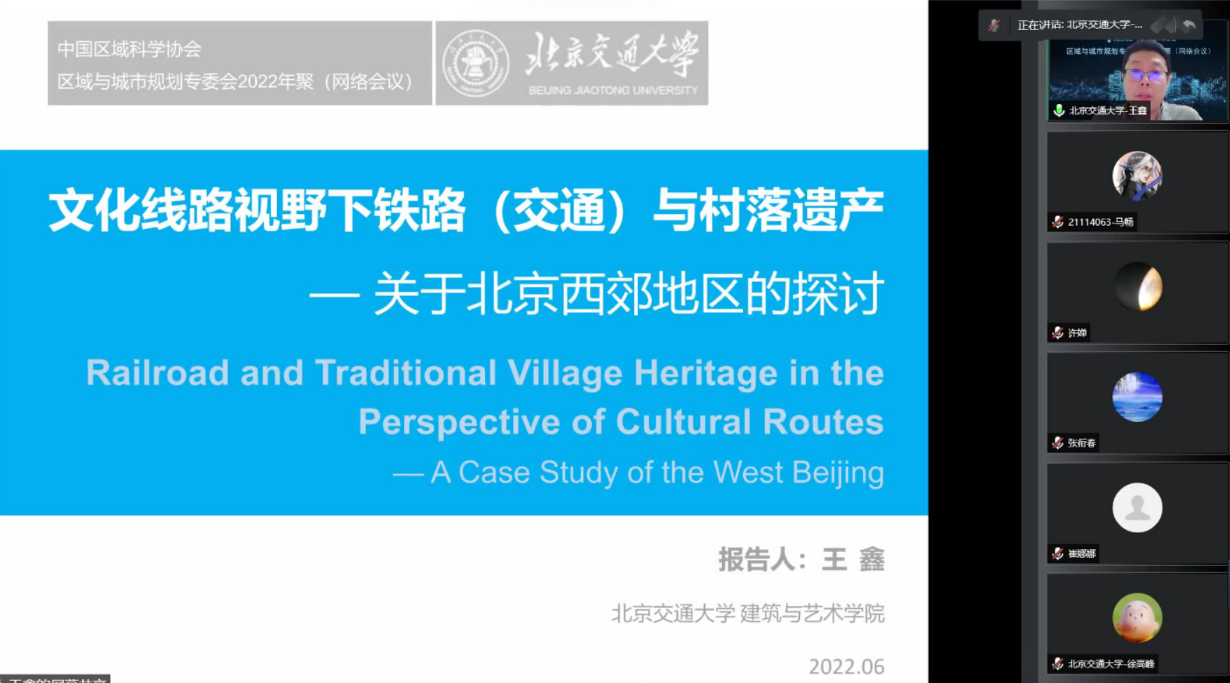 2022年6月18日,中国区域科学协会区域与城市规划专委会2022年会(网络会议)顺利召开。会议由北京交通大学建筑与艺术学院承办、北京北达城市规划设计研究院协办。本次会议的主题为“面向国土空间规划的新趋势、新挑战、新变革”。会议邀请来自北京大学、清华大学公共管理学院、中山大学、浙江大学、福州大学、云南大学、南京工业大学、四川师范大学、北京建筑大学和我院的学界嘉宾,以及来自中国城市规划设计研究院、北京市城市规划设计研究院、北京北达城市规划设计研究院的业界嘉宾进行主题演讲和学术交流。