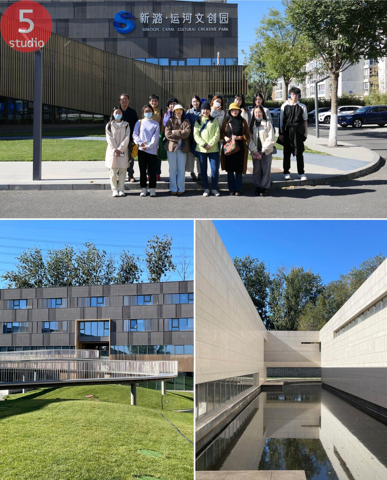 第五工作室团队早上八点半从学院门口集合乘坐大巴出发,沿线分别参观了新潞·运河文创园、千荷泻露桥及周边、城市绿心公园。