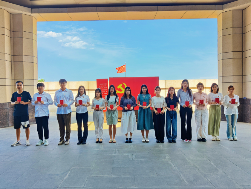 参观结束后,学院党委现场组织了党员教育活动。教师党员代表亲手为新发展学生党员佩戴党徽、颁发党章。学院党委书记秦思阳带领所有参与活动的党员重温党章,面对党旗集体宣誓,重温入党誓词。