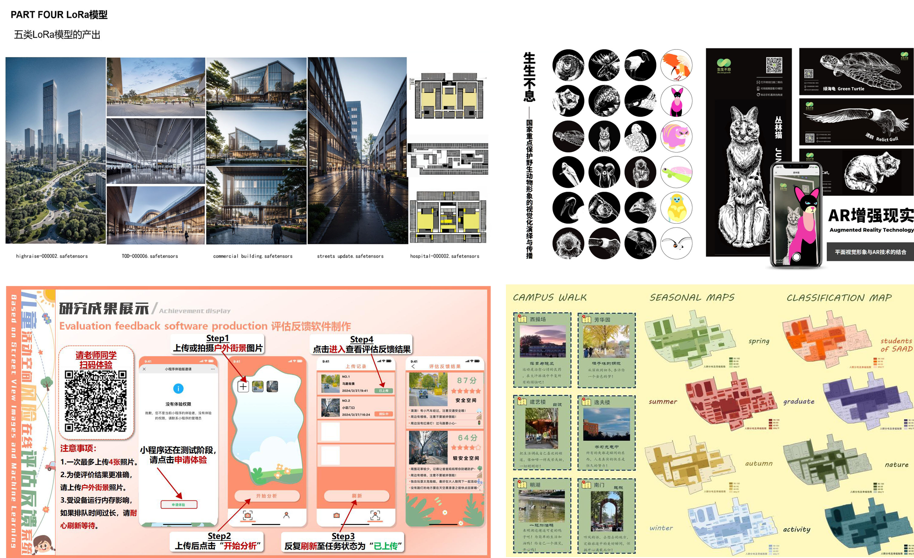 《基于街景图像和机器学习的儿童活动空间风险在线评估反馈系统》共有七项成果,将为儿童及家长提供专业渠道识别、预防可能发生的危险,为现有的儿童活动空间指出改进方向,同时也为相关专业人员提供数据、资料支持;《辅助城市设计师利用AI实现设计方式革新的研究与软件开发》项目着眼于现有AI辅助城市设计较少涉及的城市形态生成方向,以编写软件优化图生模型类AI的使用为手段,通过软件辅助设计师对AI生成方案进行评价、推演和优化。《基于历史建筑虚拟复原的 AR 交互系统——以圆明园景区为例》通过AR技术将圆明园3D复原影像投影于现存遗址上,在虚拟和现实相结合的状态下更加直观地认识历史建筑,更加深刻地感受建筑的历史,从不同侧面感受古建筑文化,实现从“观赏”“游览”古建筑到“沉浸式交互”的转变。《北京潭柘寺龙王殿交互式云游体验设计》对潭拓寺及其相关文化故事进行了详细的调研,并拟以龙王殿为切入点进行“再创作”,利用数字媒体虚拟技术对其进行深入开发,协同建设潭柘寺虚拟空间、虚拟IP、动画资产、交互衍生等新型数字文旅产品,创新潭柘寺的文旅体验模式。《龙龙生威——基于十二生肖文化的创意产品设计》于十二生肖-龙的创意产品设计,通过不同的渠道、方法,让越来越多的人了解中国十二生肖文化,设计年轻人更喜闻乐见的形象延展,推动对于“龙”的文化认同感,借此弘扬民族精神。