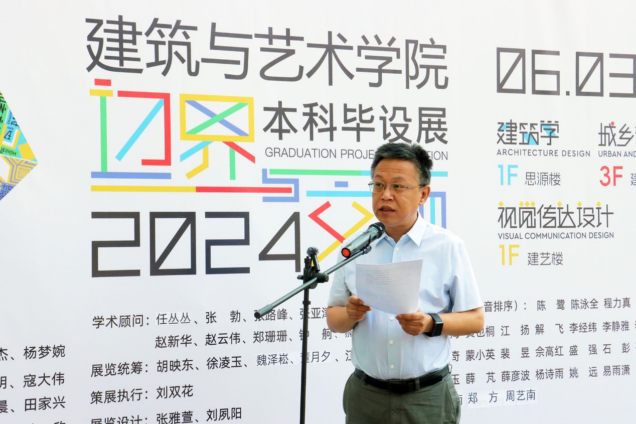 本科生院副院长景云为开幕式致辞,并代表本科生院预祝全体毕业生答辩顺利。他表示建筑与艺术学院每年的毕业设计展已经成为学校优秀的校园文化品牌活动,也是学校开启毕业季的一道亮丽风景。建艺学院发挥自身特色优势,通过毕业设计展、创意文化节等活动,落实立德树人,将美育通过多样的形式潜移默化融入师生心田,将“美”通过设计融入到经济发展、城乡建设及日常生活中,和全校师生一起,为建设美好的社会环境作出了积极贡献。