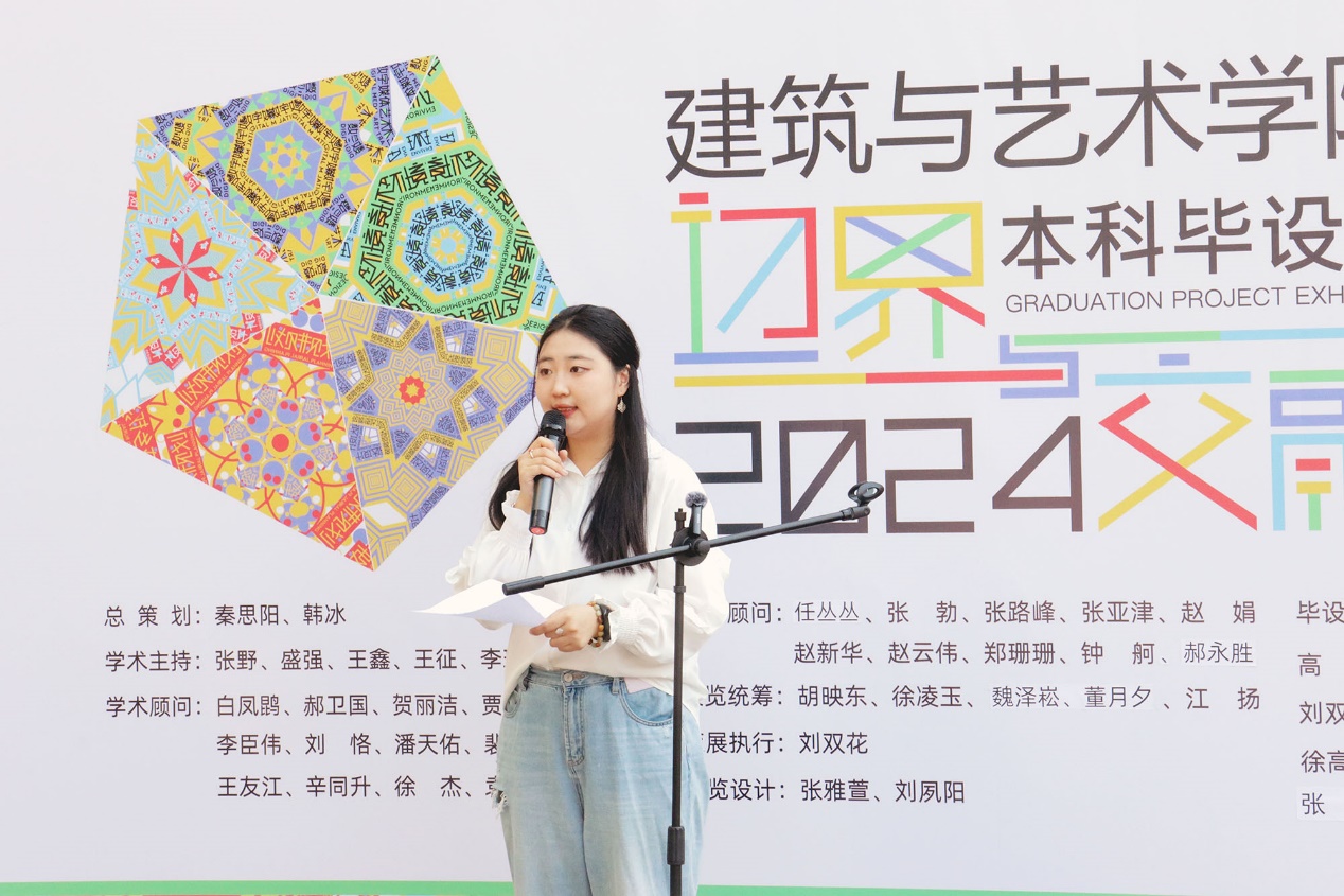 建艺学院院长韩冰致辞。他提到今年建艺学院毕业设计的主题为“边界与交融”。当今的数字时代,各种边界在不断模糊与重构,技术与艺术、传统与创新、现实与虚拟之间的界限在日益交融。本次展览中,学生们的作品将挑战传统的界限,探索新材料、新技术的应用,探索不同思想的融合,不同学科的交叉。这些作品不仅是对建筑和设计可能性的探索,更是对解放思想、开拓创新精神的践行。希望通过这样的交流,激发更多的灵感和创意,为未来的建筑和设计行业注入新的活力和可能性。