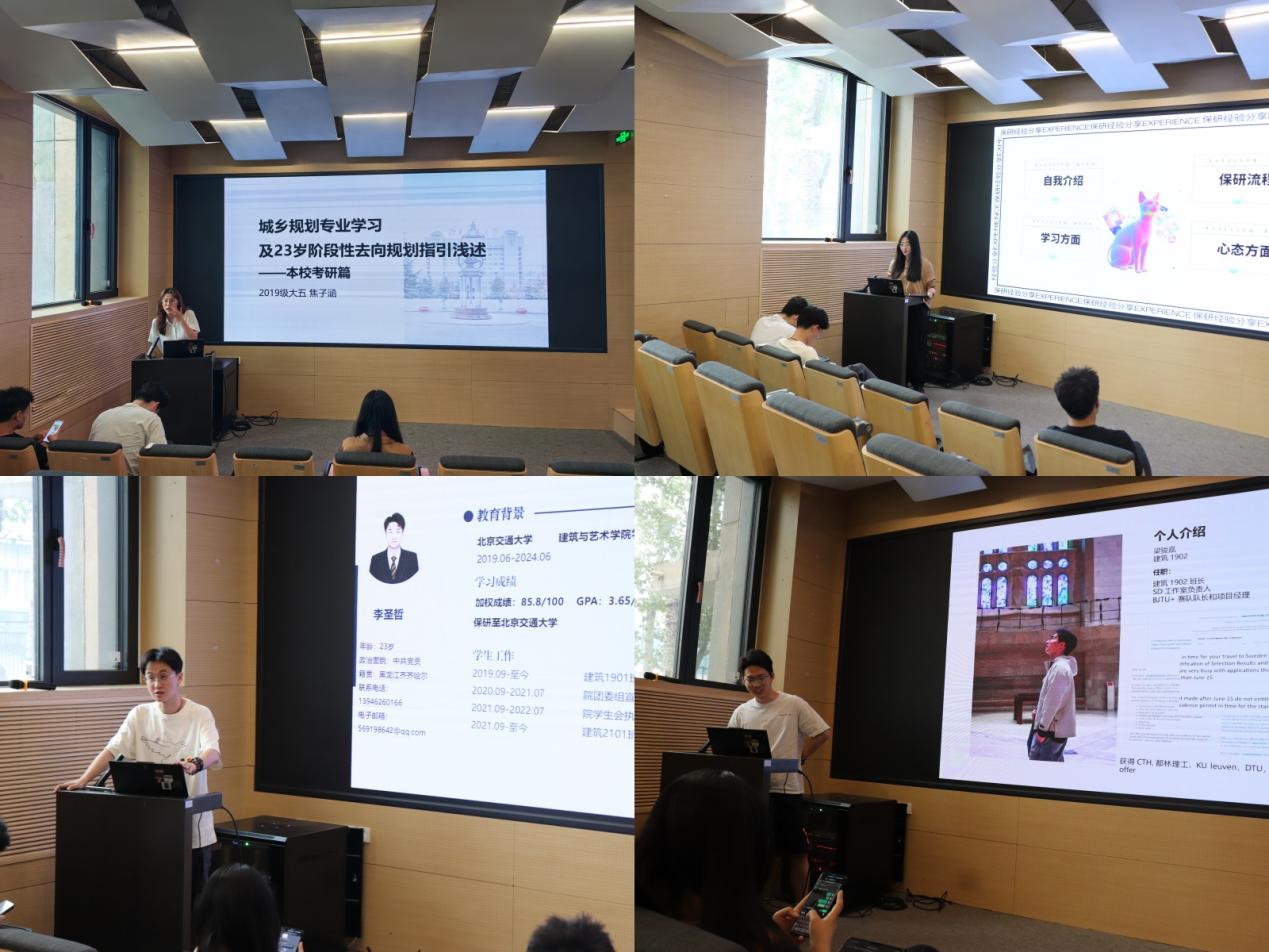 本次榜样宣讲会共有4名优秀的2024届本科毕业生代表为同学们分享经验,内容涵盖专业学习、就业考学、社会工作、科技创新、文体生活等个方面。城规1901班焦子涵同学分享了自己专业学习和考研备考不甘困苦、砥砺前行的经历,鼓励学弟学妹们不畏艰难、敢于攀登;数媒2001班郎轩怡同学围绕学习保研和夏令营申请,大家讲述了如何发挥自己的闪光点增强专业优势,鼓励大家在忙碌的学习中保持积极乐观的生活态度;建筑1901班李圣哲同学生动风趣的讲述了自己年大学时光,主要分享了自己选择做学生干部的体会以及工作保研的经历建筑1902班梁骏嘉同学从自己参加学科竞赛和留学申请的经历分享经验,鼓励大家勇于创新、敢于尝试。