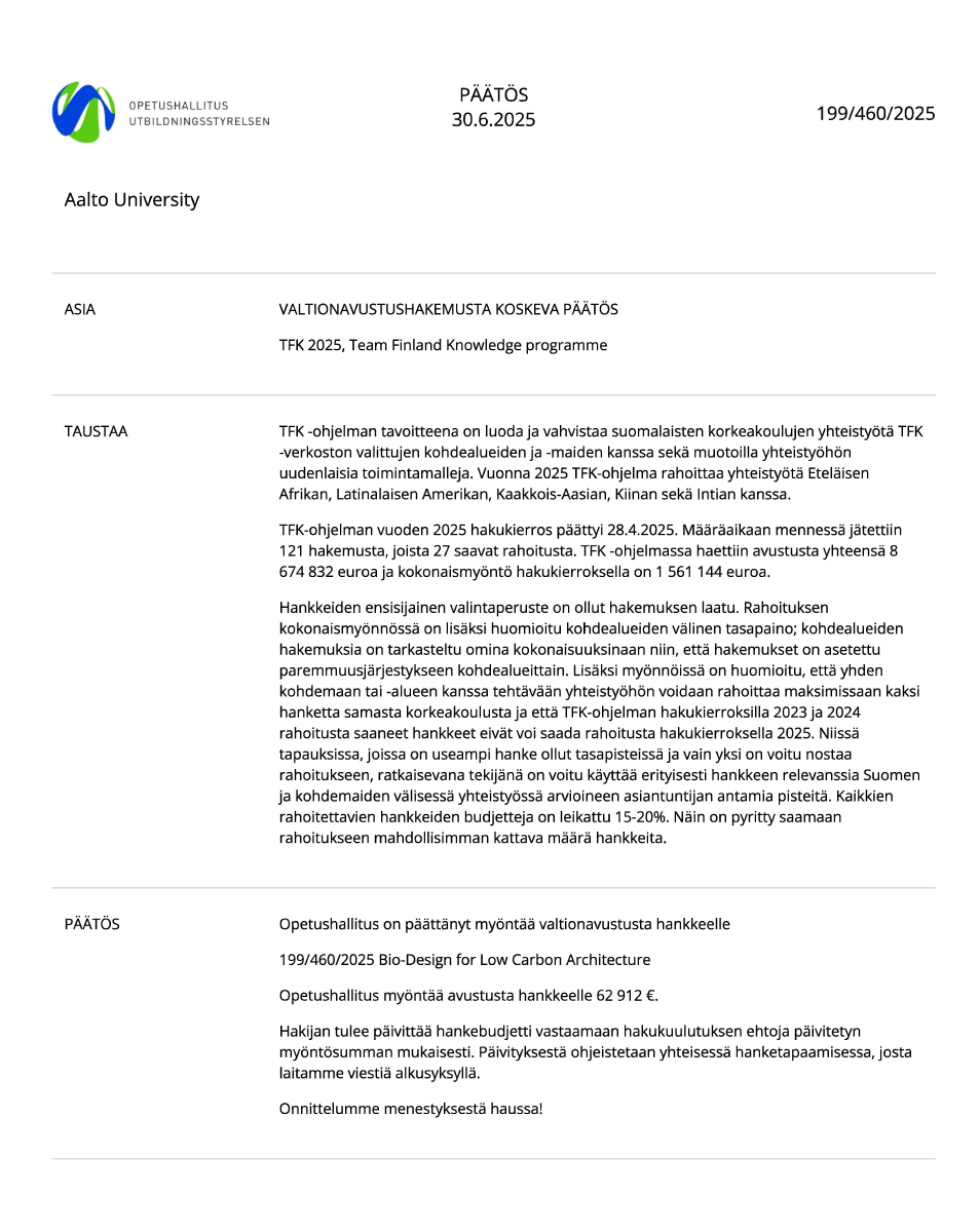 在学校国际处的组织和推动下,由建筑与艺术学院建筑系牵头申报的北京交通大学与芬兰阿尔托大学国际合作交流项目“Bio-Design for Low Carbon Architecture”(基于生物质材料的低碳建筑设计)成功获批。该项目由芬兰国家教育署资助,隶属于芬兰知识团队计划(Team Finland Knowledge,简称“TFK”)。