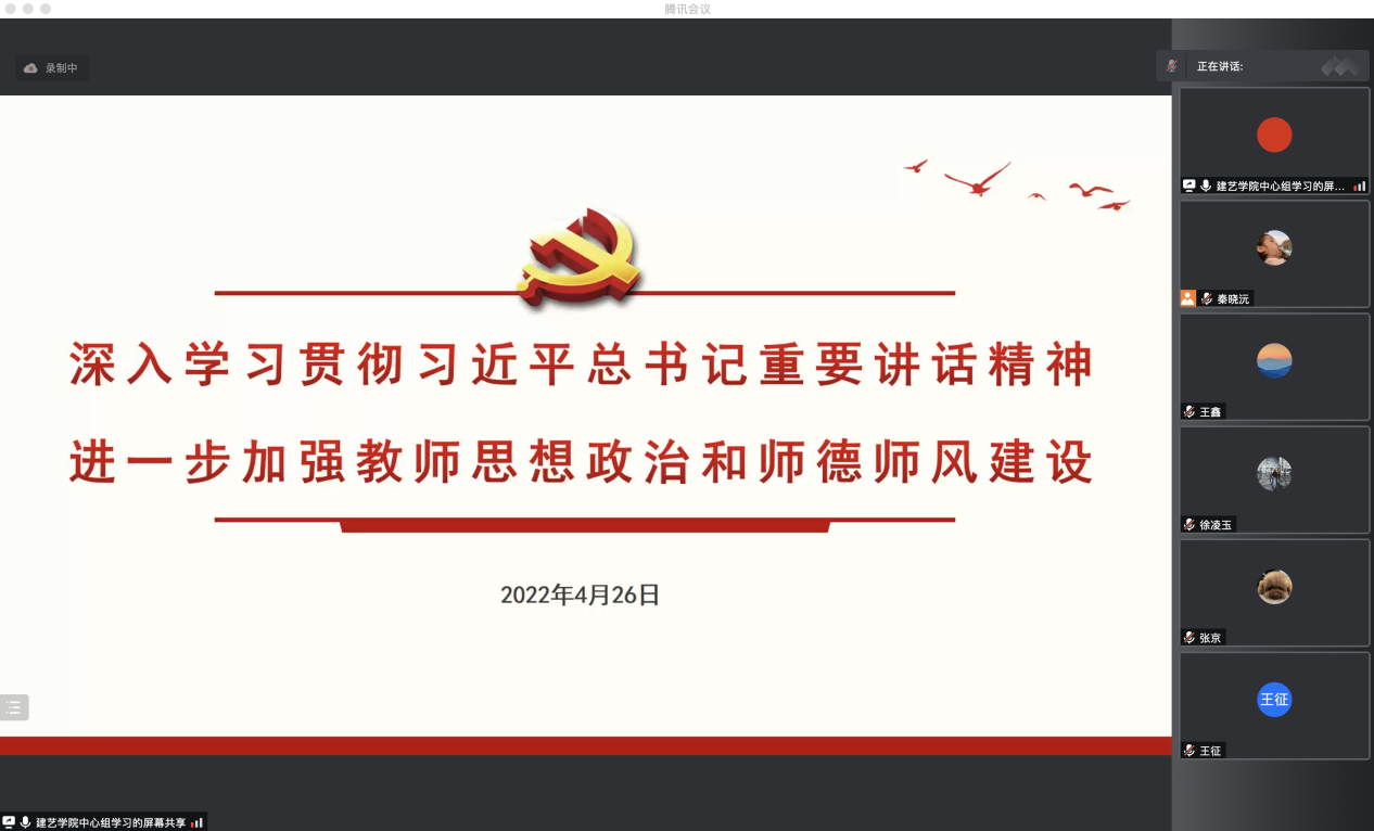 2022年4月27日,建艺学院党委围绕“深入学习贯彻习近平总书记重要讲话精神,进一步加强教师思想政治和师德师风建设”主题,召开学院党委理论中心组学习扩大会议。会议由学院党委书记秦思阳主持,学院党委理论中心组机关人员现场参会,各系系主任、党支部书记线上参加会议。