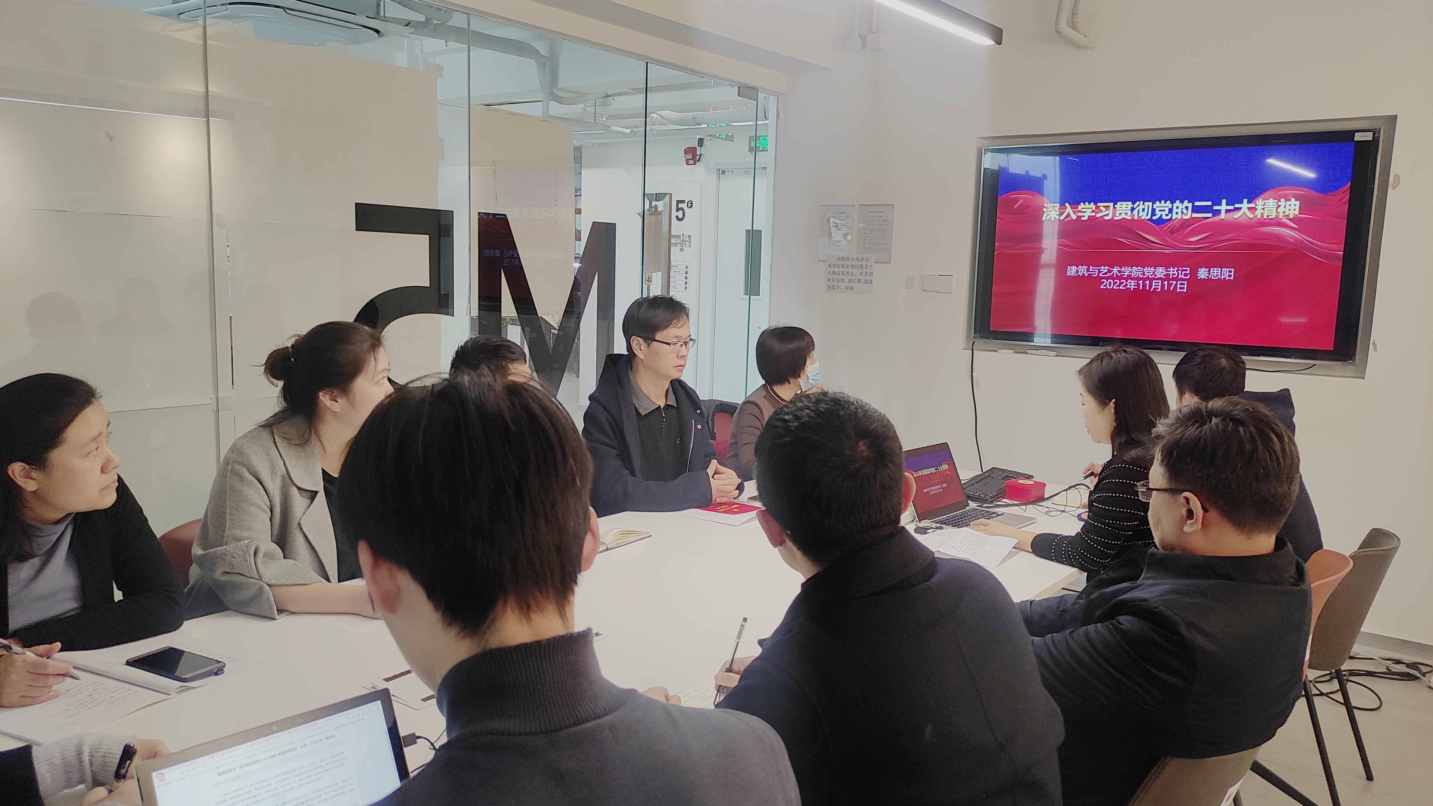 2022年11月17日,建艺学院党委理论中心组专题学习党的二十大精神,会议由学院党委书记秦思阳主持。秦思阳传达了学校党委刚刚下发的《关于认真学习宣传贯彻党的二十大精神的通知》,强调指出:学习宣传贯彻党的二十大精神,是当前和今后一个时期的首要政治任务,全体中心组成员要带头学习,要确保学深学透、入脑入心,把学习党的二十大精神转化为全院师生奋进新征程、建功新时代的强大力量。