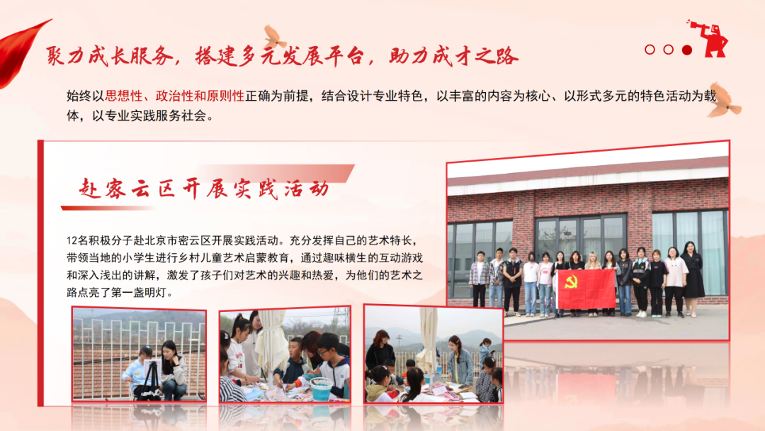 结合建筑与艺术专业特色,支部组织党员将专业所长转化为服务社会的实际行动:赴北京密云区开展乡村儿童艺术启蒙活动,为乡村孩子播撒美育种子;深入科左后旗打造“民族大团结”美育课堂,通过绘画、彩泥创作等生动形式,在艺术实践中促进民族团结,以实际行动践行青年党员的社会责任。