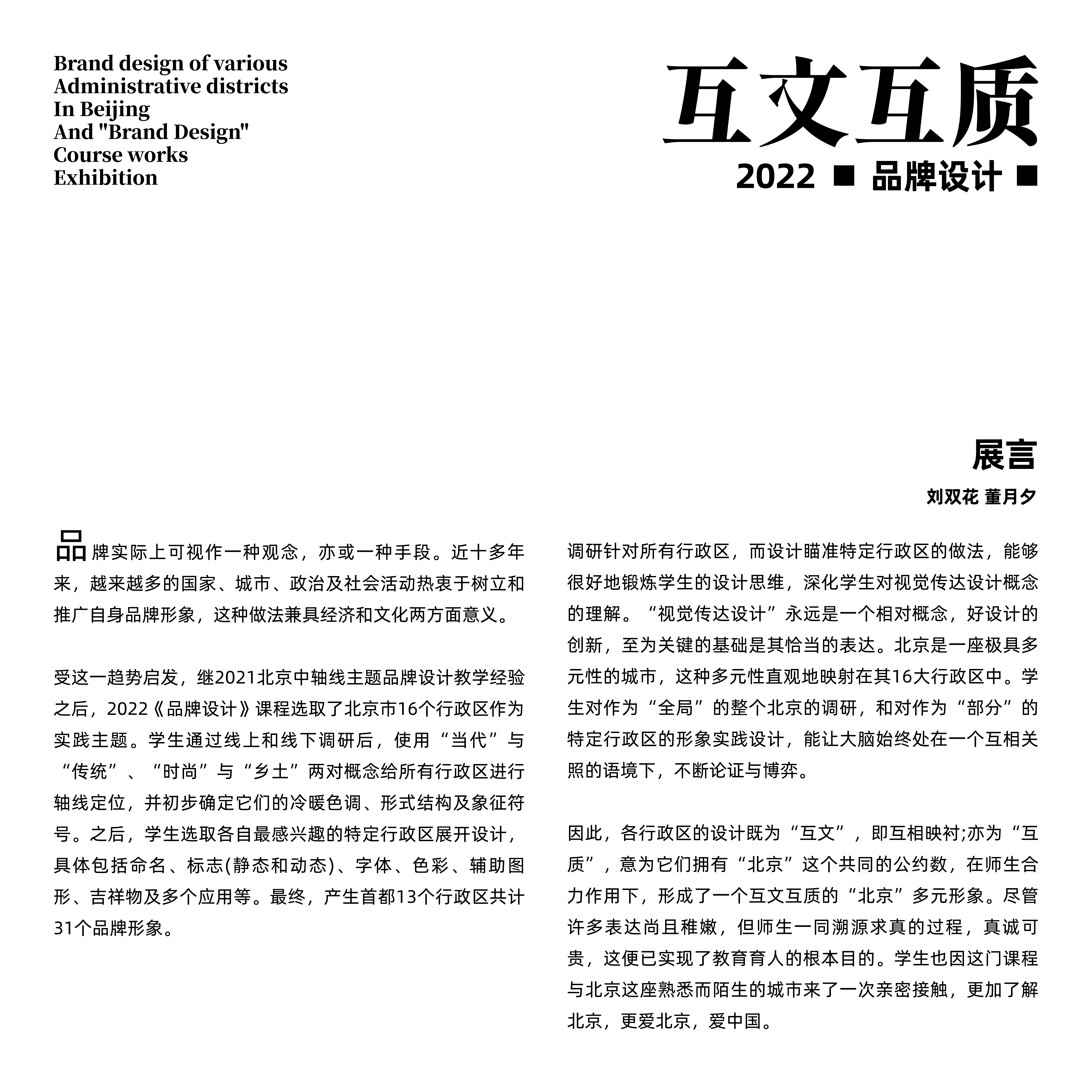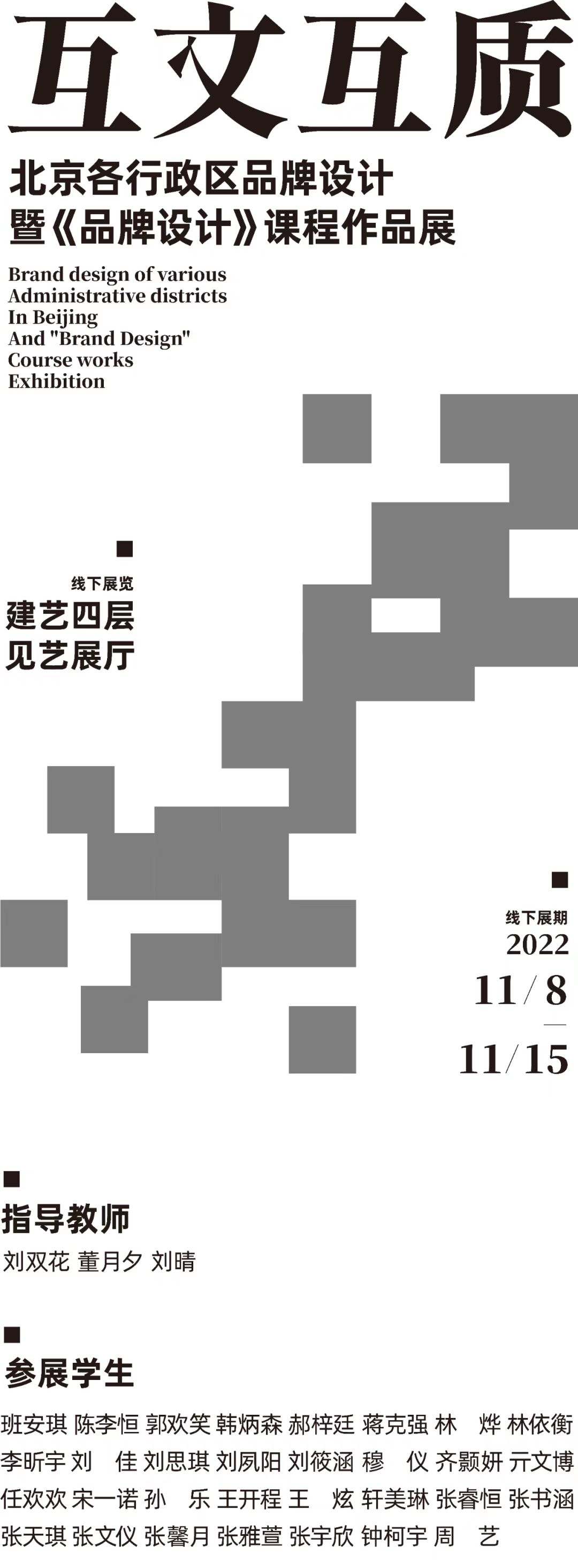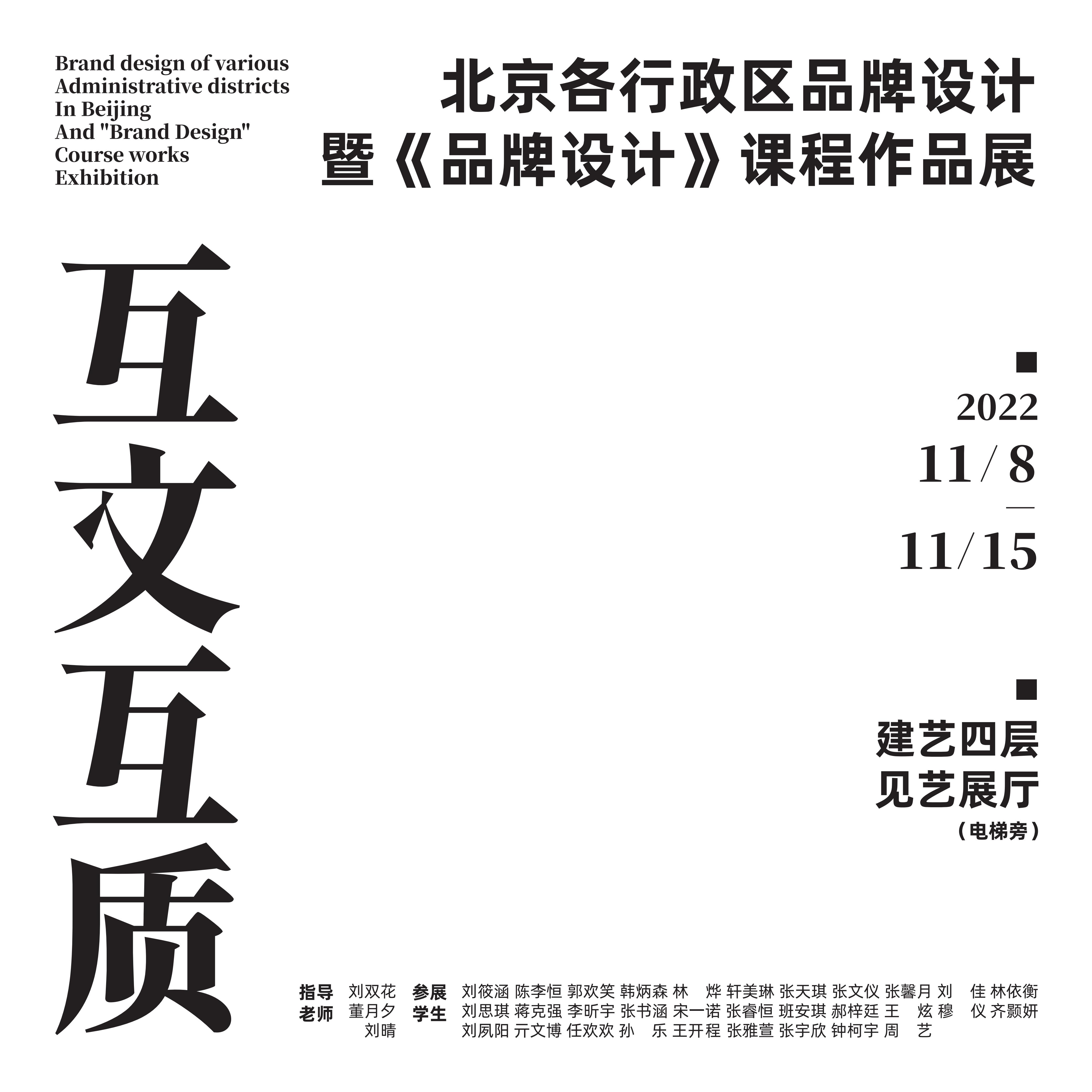 10月底至11月初,北京交通大学建筑与艺术学院第11工作室在导师刘双花、董月夕指导下,带领工作室成员及2001班部分同学,共同为为期六周的《品牌设计》课程策划了线上和线下展览。11月9日,名为“互文互质|2022《品牌设计》课程作业展”如期开展。展览展示了工作室成员及所在班级2001班同学的课程成果,包括东城、西城、朝阳、海淀、丰台、顺义、通州、石景山、延庆、怀柔、房山、门头沟、密云等13个首都行政区的品牌形象设计。