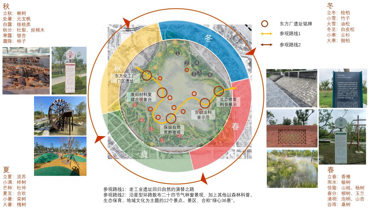 最后到达的是城市绿心公园。“城市绿心森林公园”以“近自然、留弹性、活文化”为设计理念,栽植近百万株各类乔灌木植物,林木覆盖率达到80%以上,是北京城市副中心面积最大的一处集生态修复、市民休闲、文化传承于一体的城市森林公园,也是城市副中心生态建设最核心的部分。这里以原东方化工厂老工业遗址的生态修复为核心,在原状生态保育区的外围,形成一条星型环路,沿星型环路散布二十四节气林窗景观,加上其他以森林科普、生态保育、地域文化为主题的12个景点、景区,合称“绿心36景”。