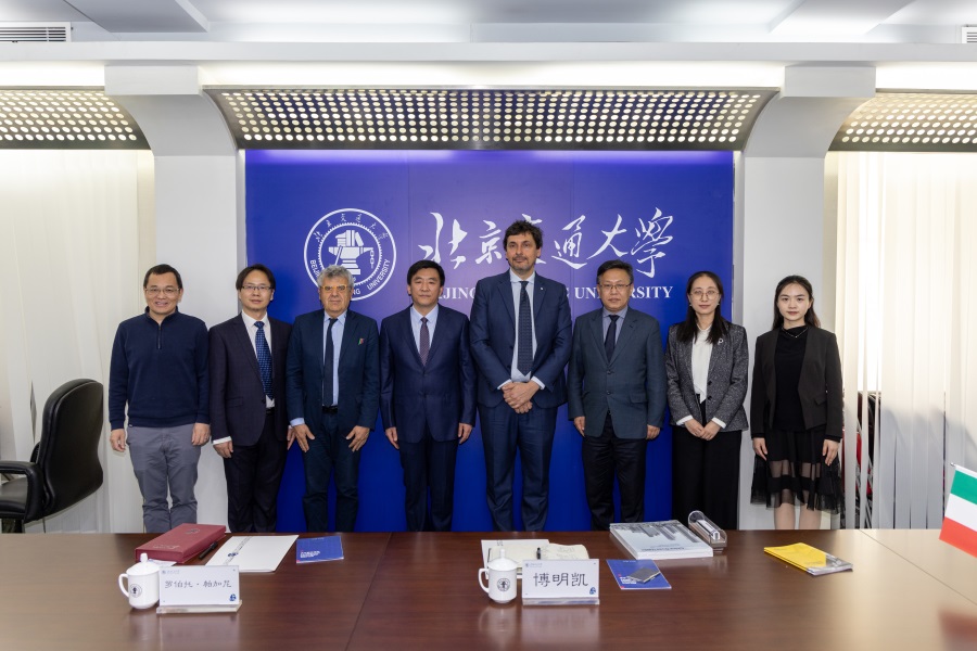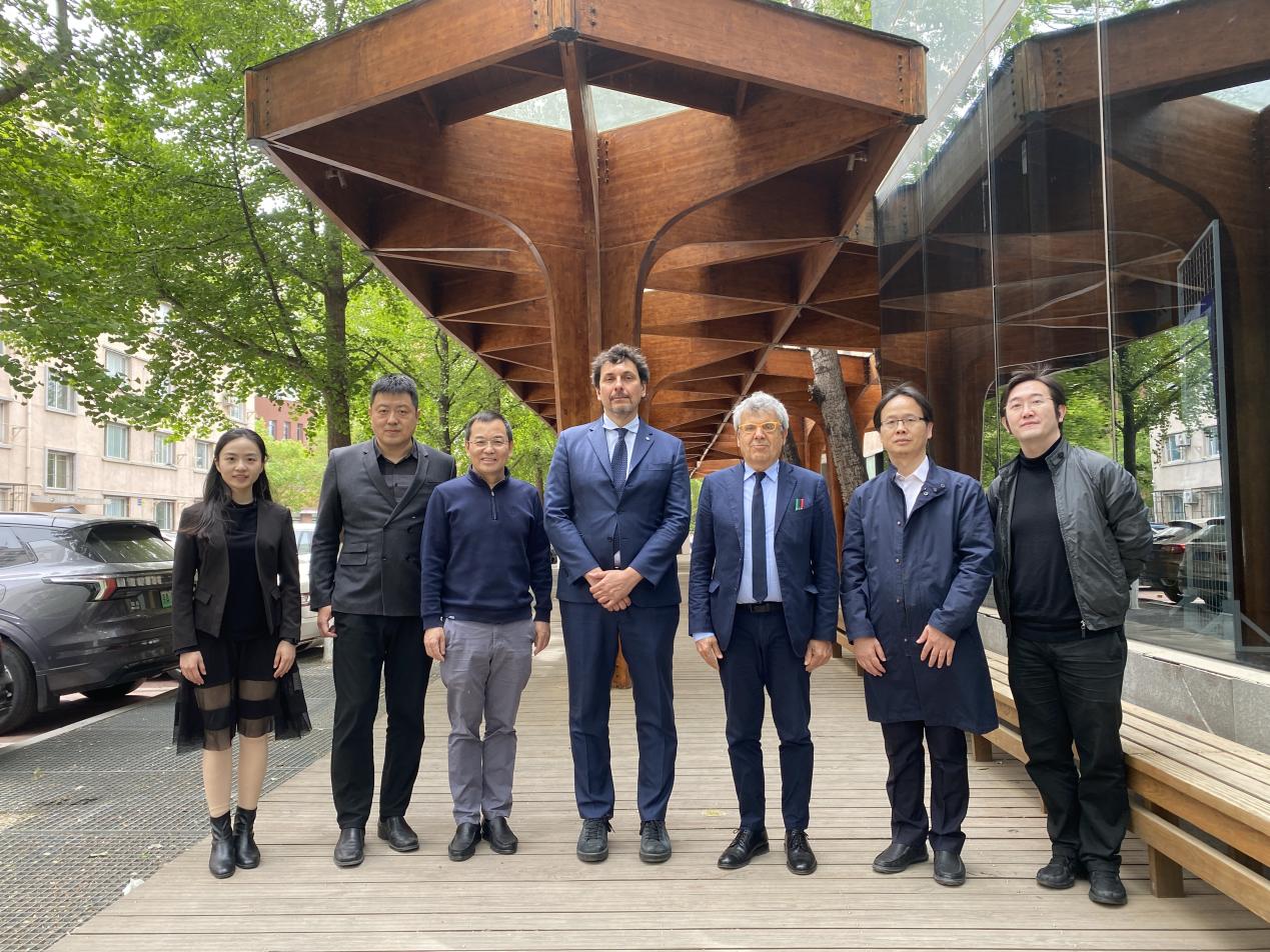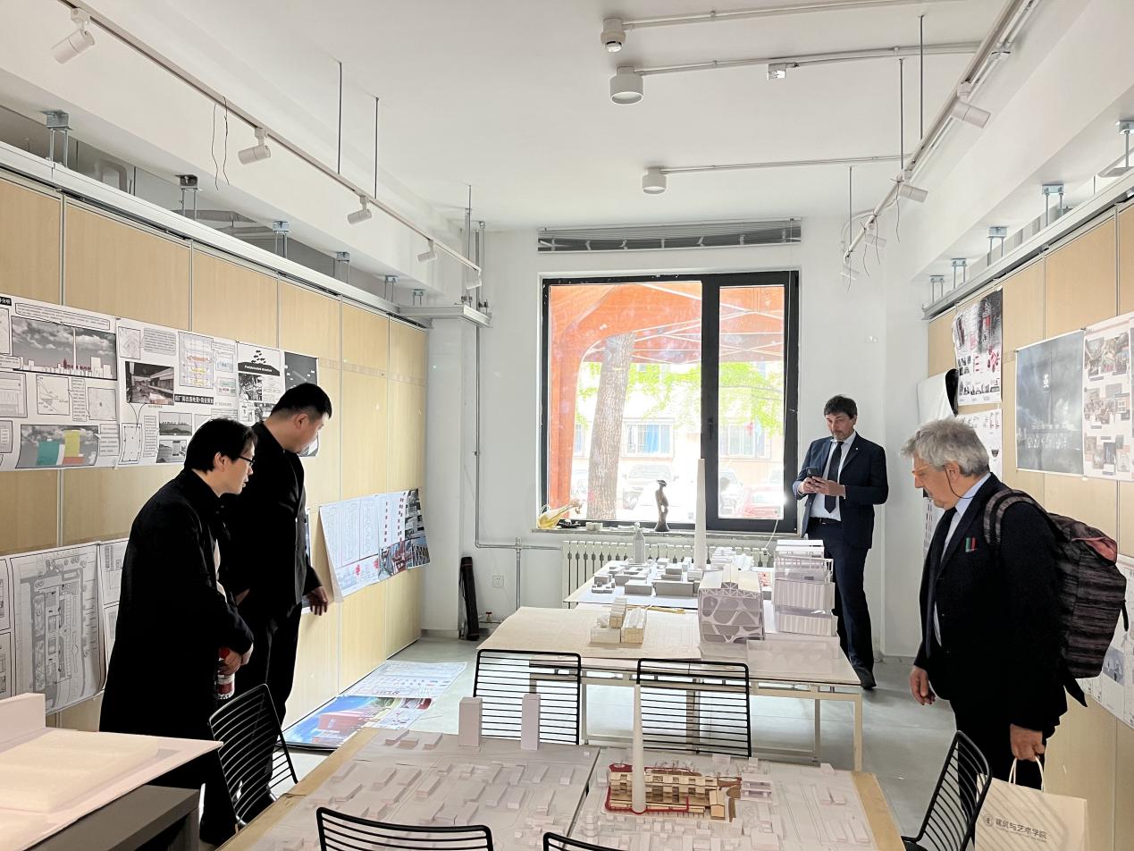 随后,博明凯教授一行在建艺学院就都灵理工大学建筑与艺术学院与我院院系合作开展进一步沟通交流。本科生院副院长邓涛、研究生院副院长江辉、建艺学院院长韩冰、副院长佘高红、副院长张野、“卓百教授”郑方、建筑系主任盛强出席。韩冰、博明凯分别就两院院系发展现状及未来目标进行简要介绍。韩冰热烈欢迎博明凯教授一行来访,期待能与都灵理工大学建筑与艺术学院合作,进一步加强我院教学科研国际化水平。博明凯表示感谢,并就未来合作模式提出建议,希望未来与北京交通大学建艺学院一道,为中意两国建筑、规划及设计领域的人才培养作出新的贡献。双方就学科发展、院系合作等方面进行了深入的交流与探讨。