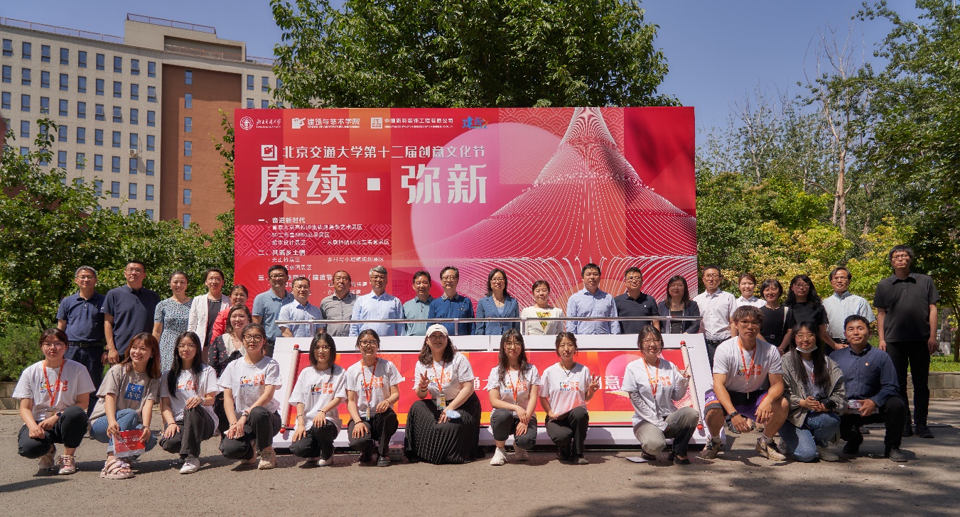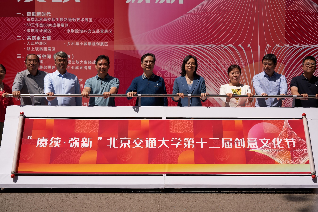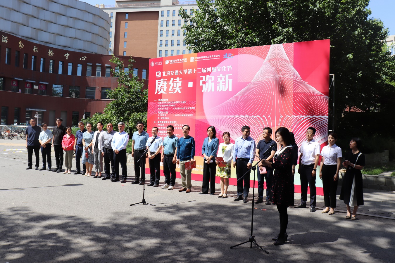 初夏的校园阳光和煦、绿树成荫。5月23日上午,主题为“赓续·弥新”的北京交通大学第十二届创意文化节开幕式在建艺学院伞亭广场精彩开幕。校党委副书记文海涛,中国铁路摄影家协会副主席兼秘书长王博轩,中国铁道博物馆党委副书记、工会主席刘恒,《铁道知识》杂志社原社长、主编魏宗燕,中建新科装饰工程有限公司党总支副书记罗阳等,北京京诚集团有限责任公司副总经理王永久等,密云区溪翁庄镇市民活动中心主任季新等,学校党委宣传部、学工部、研工部、团委、后勤集团、保卫处、外联处、就业与创业指导中心等相关单位负责人,建艺学院师生代表共同参加开幕式。
