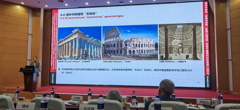 俄罗斯建筑与建设科学院外籍院士、北京交通大学建筑与艺术学院韩林飞教授做了题为《溯源中的思辨、发展中的探索、东西方的异同》的报告,回顾并反思了现代建筑百年的发展历程,提出了对建筑“本体论”的思考。