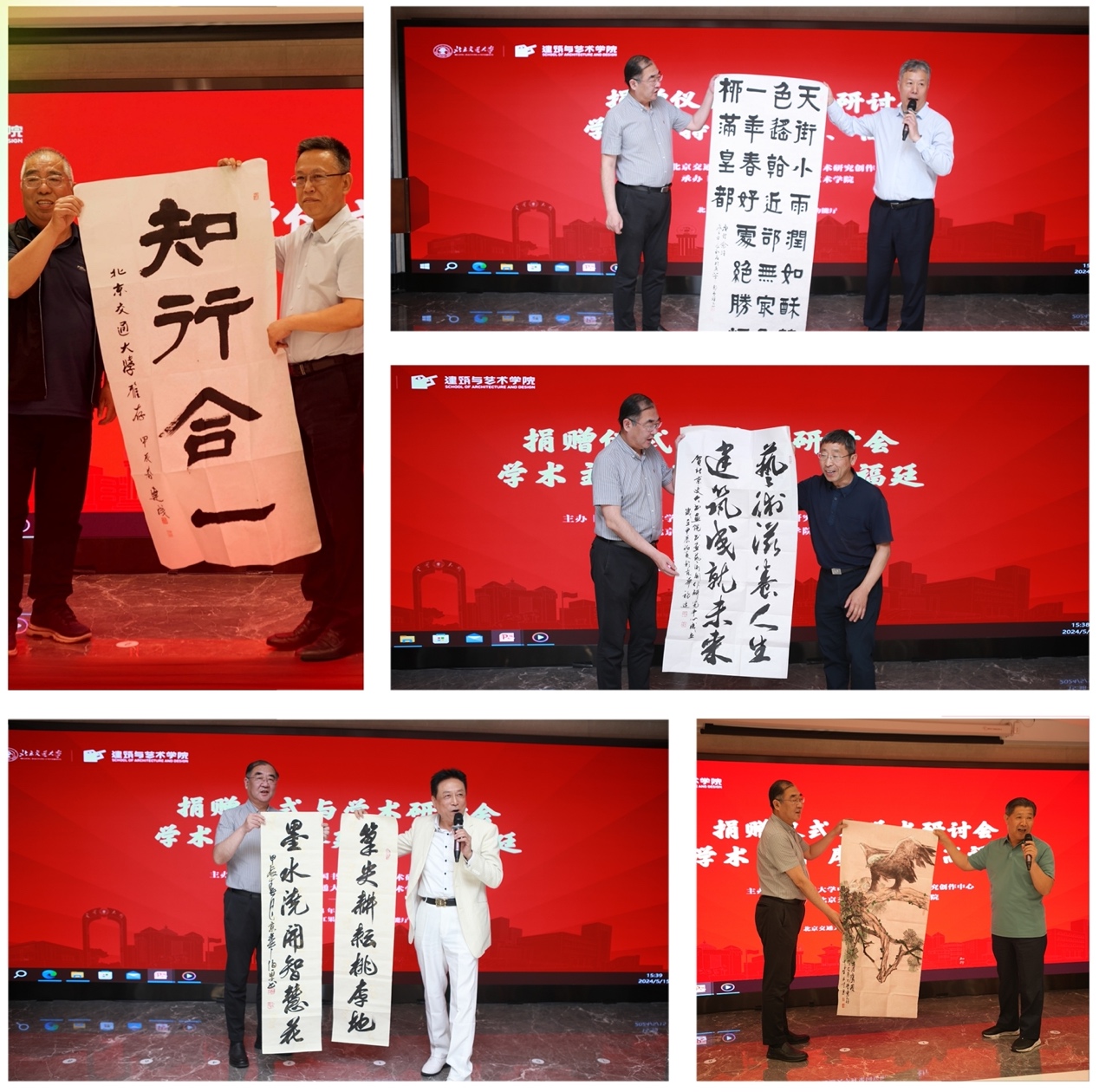 廖庭建和高福廷主持了本次活动中的书画作品捐赠仪式,校办主任姚念龙代表学校、建艺院长韩冰代表书画院接受了捐赠。本次共接受捐赠书画精品近 30 件。捐赠仪式结束后,中心全体成员就中心未来的创作发展和工作部署进行了学术研讨。