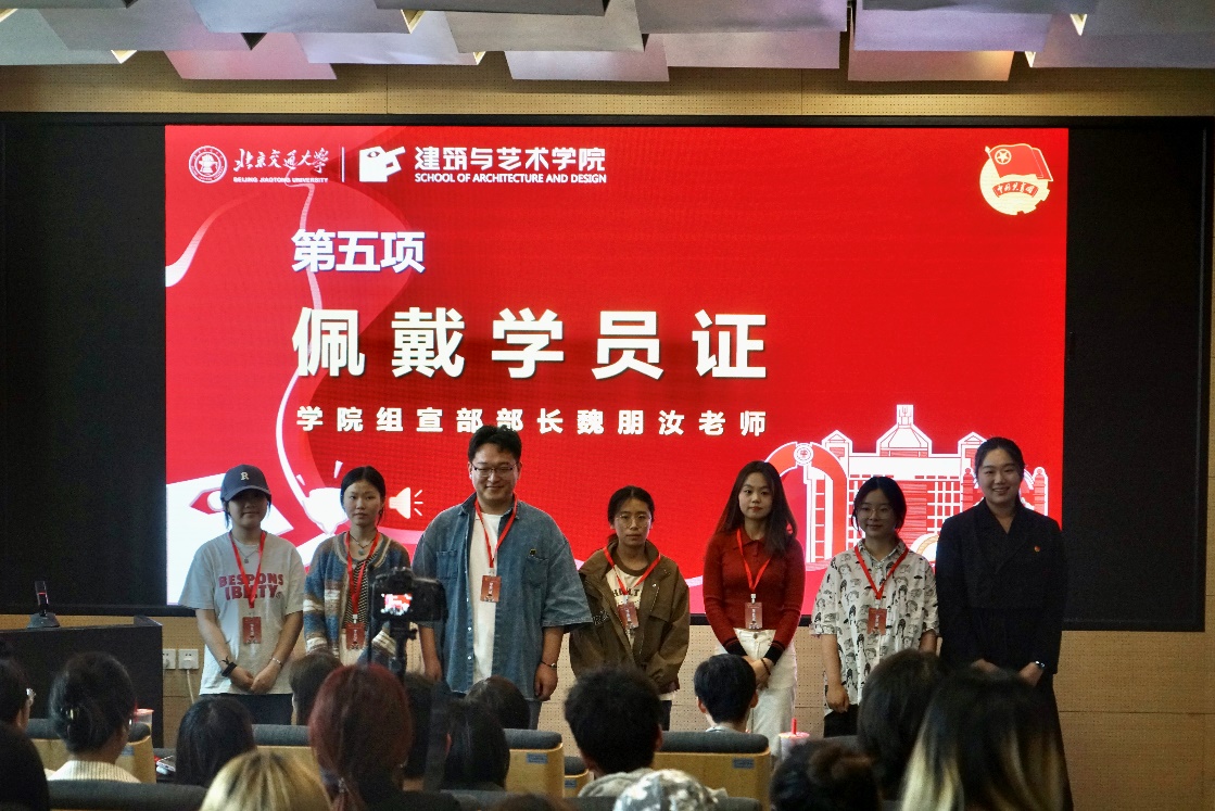 学院组宣部部长、本科生辅导员魏朋汝为第四届“望者”计划学生骨干培训代表佩戴学员证。学员证由建艺学生自主设计,以朝气蓬勃,温暖洋溢的橘红色为背景,下方的人物用一双望远镜向远方眺望,象征着朝气昂扬的建艺学子,在充满挑战与希望的未来勇担重任,为实现中华民族的伟大复兴而奋斗。